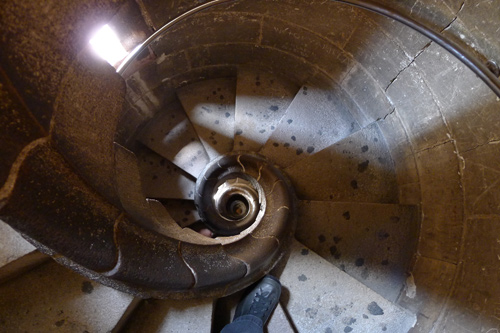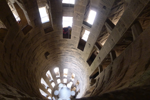 Niz toranj se potom spušta uskim strmim stepenicama. Pogled unutar tornja: